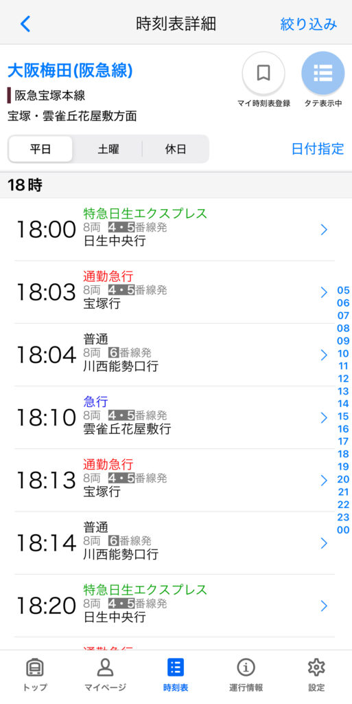 - いつも乗る時間が決まっているなら、その前後の時刻表を暗記するだけでOK。(通急なら一の位が3の時刻に大阪梅田発)